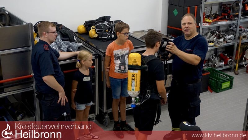 Bei der nächsten Station durften sie die Feuerwehrkleidung kennenlernen. Da staunten sie nicht schlecht, als sie gesehen haben, was die Feuerwehrleute beim Einsatz alles mit sich tragen. Besonders das Atemschutzgerät faszinierte die Kinder. Außerdem wurde den Mädchen und Jungen das Gerätehaus der Feuerwehr gezeigt.