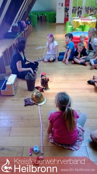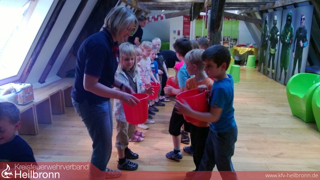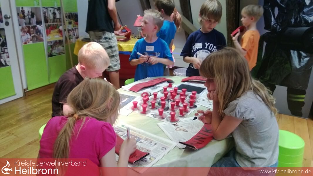 Beim Abschied gab es kurz sogar Tränen! Felix wollte nicht ins Museum. Er dachte, da stehen nur alte Feuerwehrautos. Zum Schluss war auch Felix hellauf begeistert von der Ausstellung "s`brennt" und der Führung und Anleitung von Frau Schick, im Neckarsulmer Stadtmuseum.Zwölf Kindern der Neudenauer Kinderfeuerwehr waren bei dem kleinen Ausflug dabei.Im Stadtmuseum angekommen erklärte Frau Schick zuerst die zeitlichen Abläufe im Umgang mit dem Feuer. Dafür bediente sie sich eines Seiles, gewissermaßen als Zeitstrang. Am Anfang konnten die Menschen kein Feuer machen. Sie waren auf Blitzschläge und Vulkane angewiesen. Den Umgang mit Feuer mussten sie auch erlernen. Nach und nach stellten sie fest, dass Feuer wärmt, dass es zum Kochen und Braten genutzt werden kann und dass es die wilden Tiere fern hält.Dann kamen die ersten Utensilien um selbst Feuer zu machen. Feuersteine oder aber auch die Holzstäbchen solange drehen, bis aus der Reibung Wärme und schließlich Feuer wird.Weiter im Zeitstrang bauten die Menschen dann Häuser und Städte. Nun wurde der Brandschutz wichtiger. Die ersten Alarmsignale und auch organisatorische Abläufe bei Bränden wurden festgeschrieben. Es gab die ersten Ausrüstungsgegenstände, die heute noch vorhanden sind, so zum Beispiel den Helm.Angekommen in der Gegenwart ist Feuer machen kein Problem mehr. Heute haben wir dafür Feuerzeug und Streichhölzer.Mit Eimern wurden dann Spielbälle aus einem Planschbecken geschöpft, mehrere Meter mit einer Eimerkette transportiert und dann schließlich ins imaginäre Feuer gegossen. Das mit der Eimerkette erwies sich als sehr anstrengend.Logisches Mitdenken erforderte im Anschluss die Arbeit am Verbrennungsdreieck. Drei Voraussetzungen braucht ein Feuer, Zündenergie, brennbarer Stoff und Sauerstoff. Entzieht man dem Feuer nur eines, kann es nicht mehr weiter brennen.Das Absetzen eines Notrufes am Telefon, Umziehen in Rekordgeschwindigkeit und eine praktische Löschübung gehörte dann noch zur Führung.Nach einer kurzen, selbst mitgebrachten, Stärkung ging es dann an das Bedrucken von Schläuchen. Jedes Kind konnte seinen Namen auf ein Stück Feuerwehrschlauch drucken und dieses Stück dann als Erinnerung mit nachhause nehmen.Mit viel neuem Wissen und dem Schlauchsouvenir fuhren die Kinder Richtung Neudenau. Die Begeisterung über das Erlebte war ihnen anzumerken.