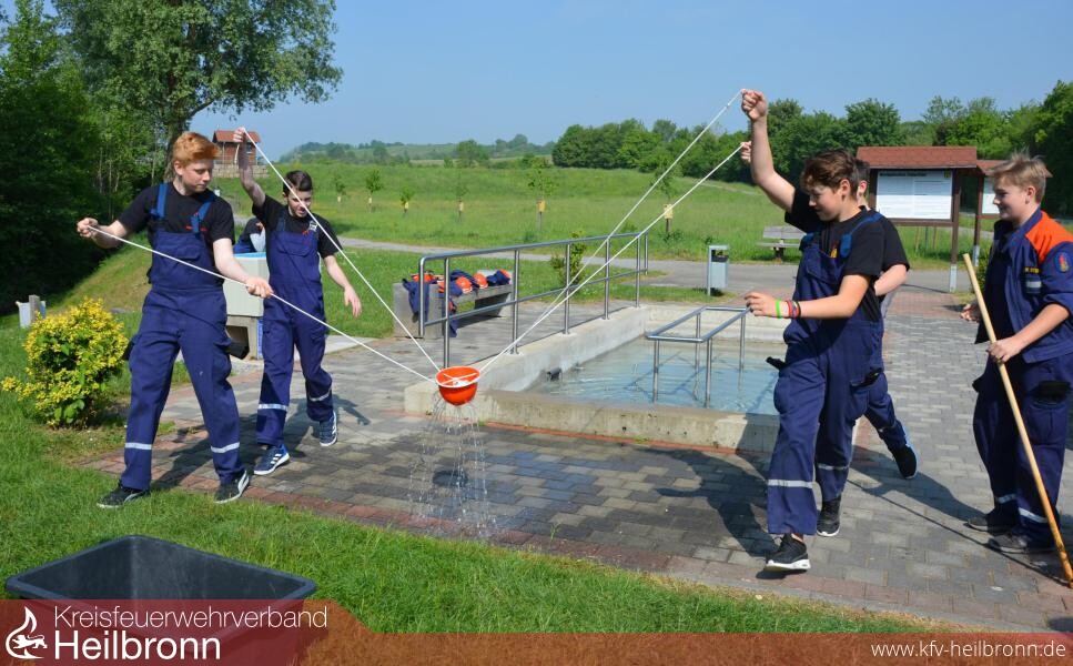 Geschicklichkeit ist am Kneippbecken der Wasserwelt gefragt. Beim Wasserschwertransport muss das flüchtige Nass in einem durchlöcherten Feuerwehrhelm vom Becken in einen drei Meter entfernten Mörtelkübel geschafft werden. An vier Seilenten hängt der Helm, da ist Teamarbeit gefragt. Daniel, Justin, Michel und Lukas ziehen an den Seilen, Nico taucht den Helm mit einem Stecken bei jeder Runde unter Wasser - und schon geht es erneut los. Nach sechs Minuten ist das 90-Liter-Gefäß genau 8,3 Zentimeter mit Wasser gefüllt. Ein gutes Ergebnis finden die Mitglieder der Pfaffenhofener Jugendwehr, die mit Teamleiter Marlon Fried unterwegs sind.