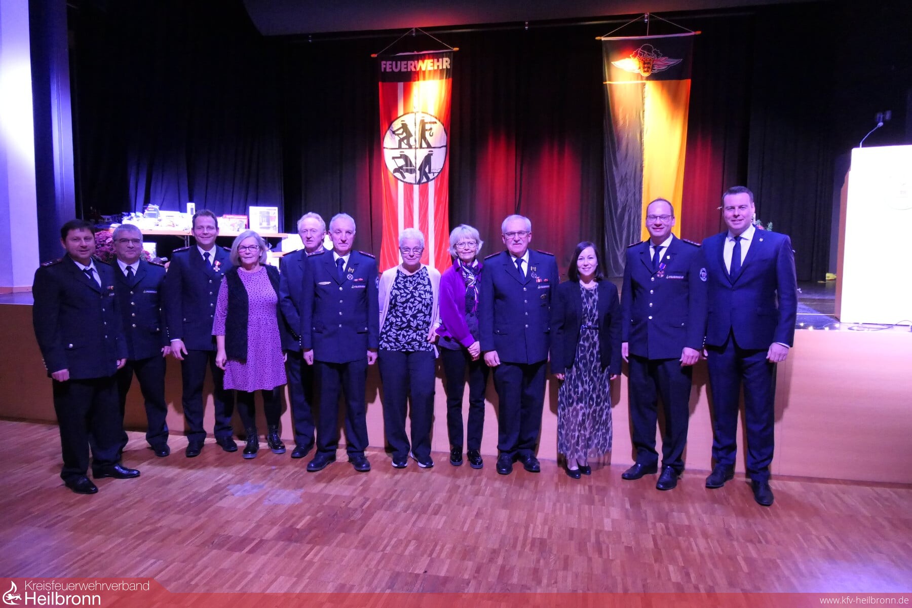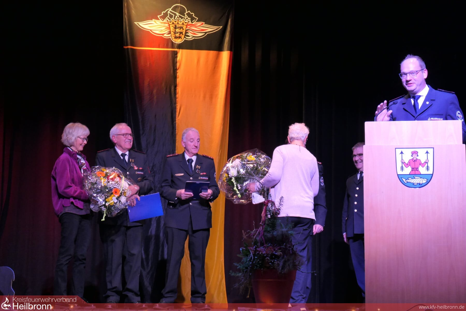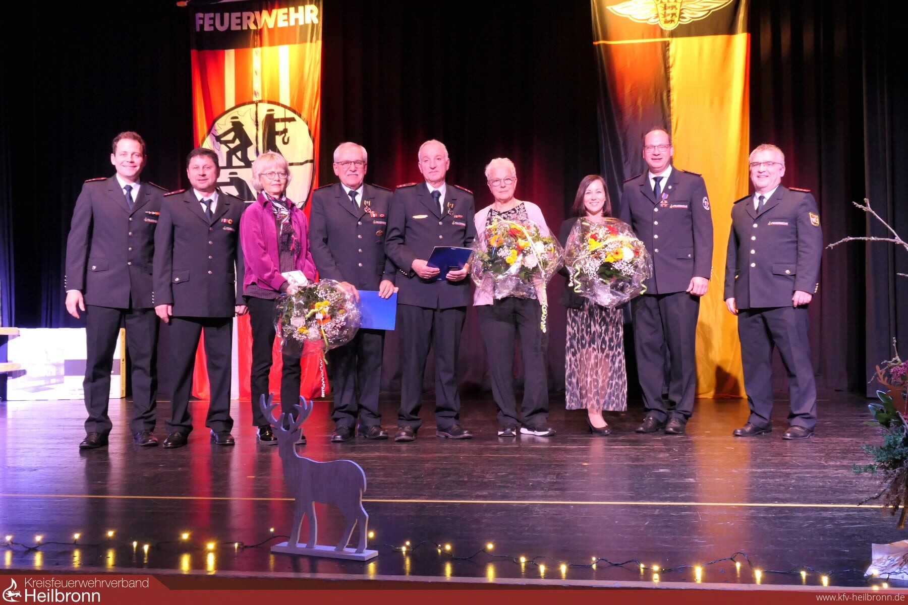 Beim Kameradschaftsabend der Freiwilligen Feuerwehr Oedheim zeichnete der Vorsitzende des Kreisfeuerwehrverbandes Heilbronn, Frank Pitz (2. von li.), zusammen mit Bürgermeister Matthias Schmitt (re.) und dem stv. Kommandant Bernd Ehrhardt (li.) Kommandant Sven Kübler für seine Tätigkeit als Kommandant und die Tätigkeit im Führungskreis mit dem Ehrenkreuz in Bronze des Deutschen Feuerwehrverbandes aus. Gerhard Last und Heinz Schmierer erhielten mit der Ehrenmedaille in Silber des Landesfeuerwehrverbandes BW für über 50 Jahre aktive Dienstzeiten und fast 30 Jahre als Zugführer und Funkverantwortlicher bzw. über 40 Jahre als Schriftführer und Pressewart der Oedheimer Wehr ebenfalls hohe Auszeichnungen. Peter Kartes wurde mit dem Ehrenzeichen in Silber des Landes Baden-Württemberg für 25 Jahre aktive Dienstzeit und der stv. Kommandant Yannick Pilz mit dem Ehrenzeichen in Bronze für 15 Jahre aktive Dienstzeit geehrt und für das große Engagement für die Feuerwehr gelobt. Als Anerkennung für die tolle Unterstützung in vielen Dienstjahren erhielten die Ehefrauen Blumen.