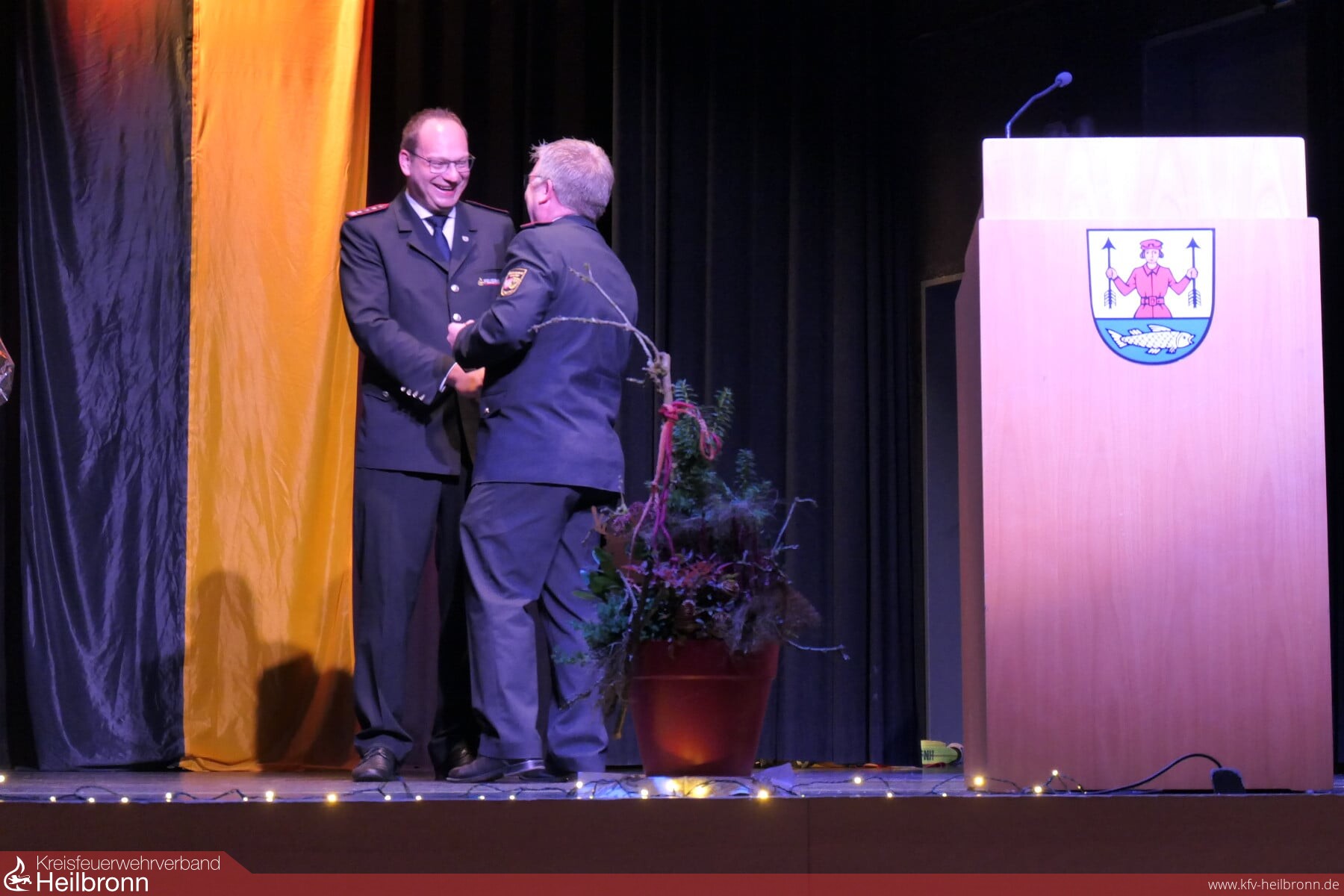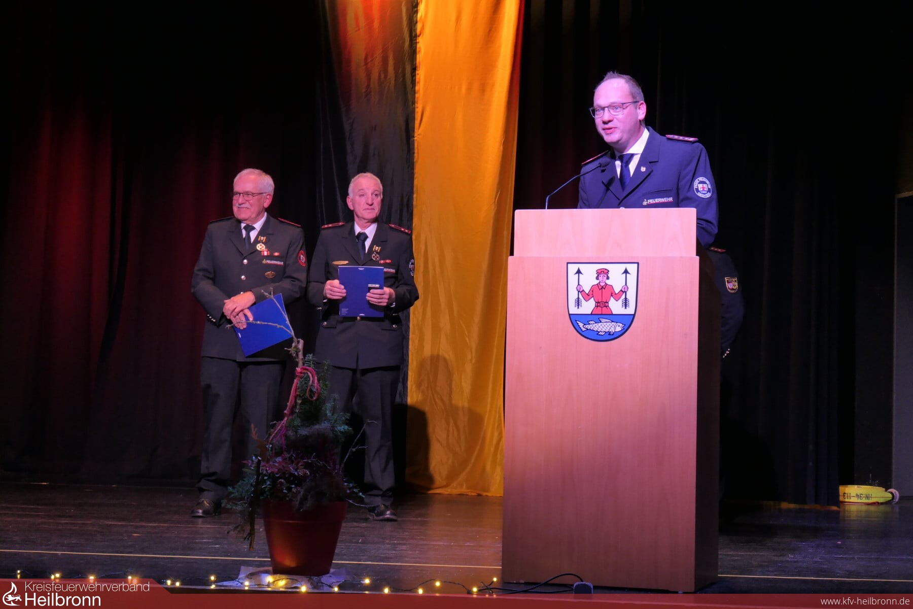 Bürgermeister Matthias Schmitt freute sich besonders, dass er den neuen Vorsitzenden des Kreisfeuerwehrverbandes Heilbronn, Frank Pitz aus Eppingen, beim Kameradschaftsabend begrüßen konnte. Frank Pitz hat in diesem Jahr die Nachfolge von Reinhold Gall angetreten. Er sprach die Rekordzahl von bisher bereits 51 Einsätzen an, gegenüber 2023 mit 34 deutlich mehr. Dabei waren mit einem Vollbrand eines Wohnhauses und dem Hochwasser Anfang Juni mehrere Großeinsätze und ansonsten das gesamte Einsatzspektrum von Türöffnungen bis zu Tiernotlagen vertreten. Auch die 18 Brandmeldeanlage-Einsätze, von denen die meisten Fehlalarme waren, sind keine Relativierung, da keiner beim Alarm weiß, was hinter dem Einsatz steckt. Die große Alarmübung in Lautenbach hat ihn begeistert. „Sie müssen eine Einheit sein, eine sehr gut ausgebildete Gruppe“. Die Gemeinde kann sich auf die Feuerwehr verlassen. Auch in Zukunft wird die Gemeinde ein verlässlicher Partner für die Feuerwehr sein. Als Bürgermeister ist er wirklich stolz auf die tolle Arbeit, die bei der Feuerwehr geleistet wird.