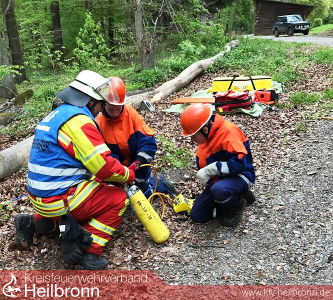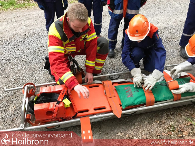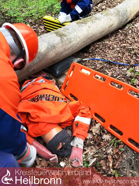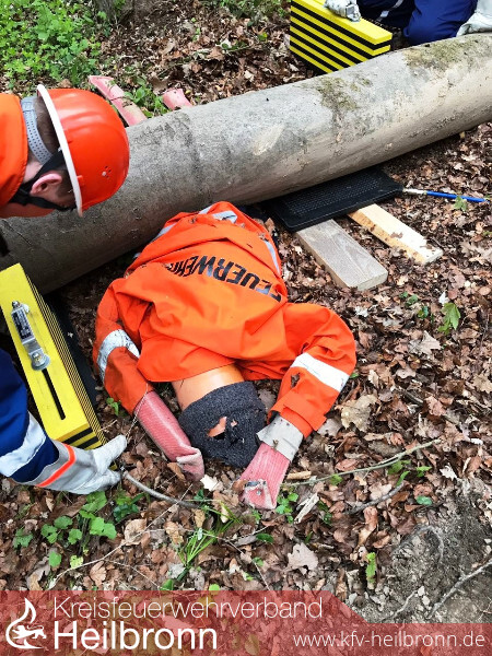 Eine unter einem Baumstamm liegende Person zu befreien übten die Angehörigen der Jugendfeuerwehr Neudenau im letzten Übungsdienst. Unter Zuhilfenahme von Hebekissen und Hölzern wurde der Baumstamm angehoben und die Person mit dem Spineboard gerettet. Außerdem wurden in der Übung die Schaufeltrage und die Schleifkorbtrage gezeigt und damit geübt.