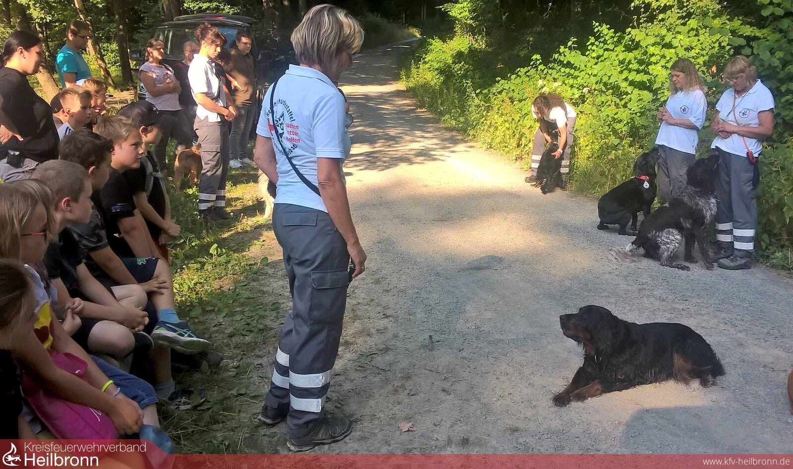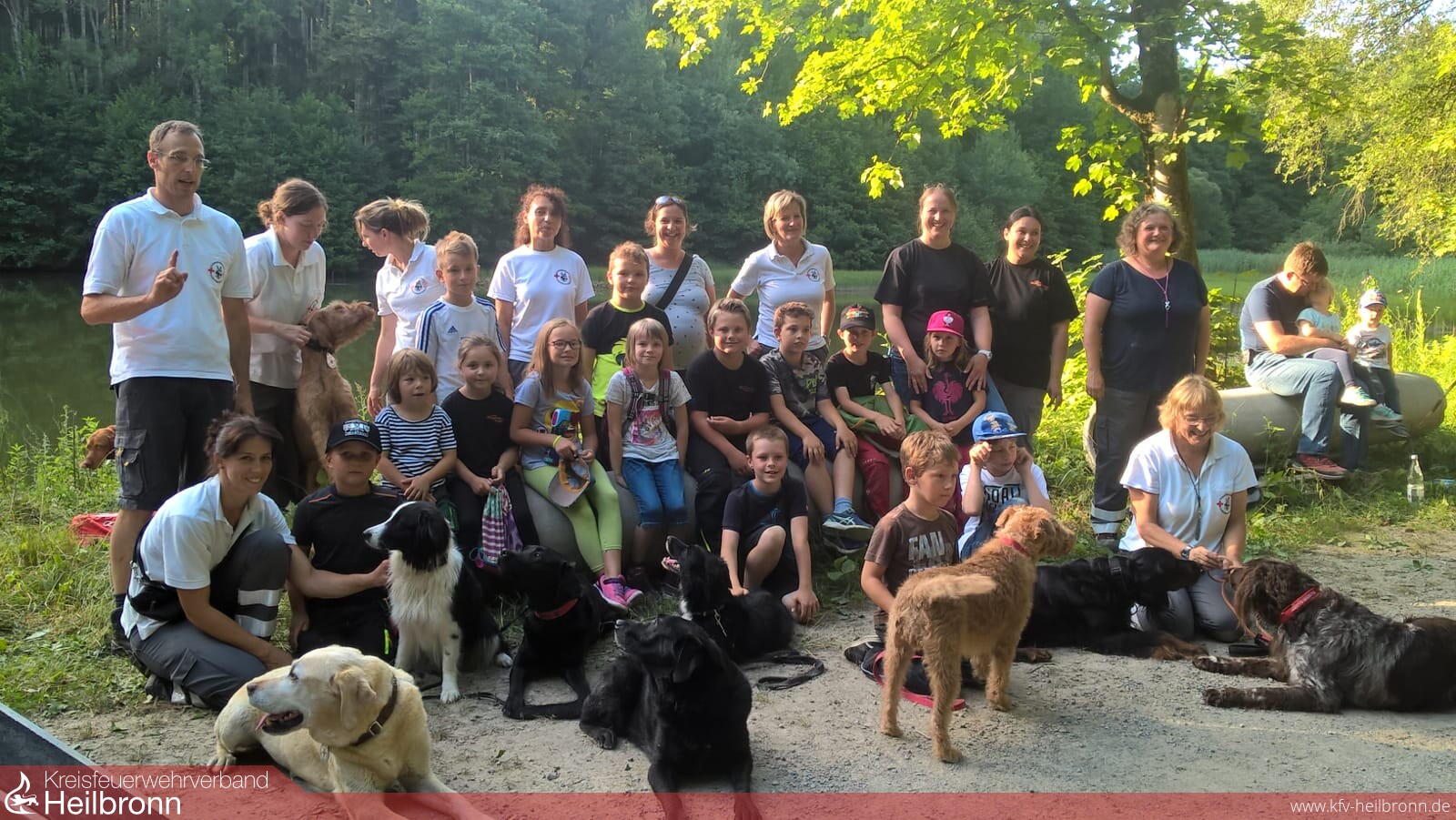 Der letzte Übungsabend war ein besonderer für die Kindergruppe der Jugendfeuerwehr Neudenau. Treffpunkt der Gruppe und Start war direkt am Parkplatz vom Böcklingsee. Nach einem kurzen Fußmarsch zum See konnten wir unsere besonderen Gäste schon sehen. Die Rettungshundestaffel Mosbach war mit einer Gruppe Hunden und Hundeführern zu Besuch. Nach einem kurzen Kennenlernen wurde uns als erstes gezeigt wie gut die Hunde hören und ausgebildet sind. Außerdem konnte man das Verhalten der Hunde in der Gruppe beobachten.