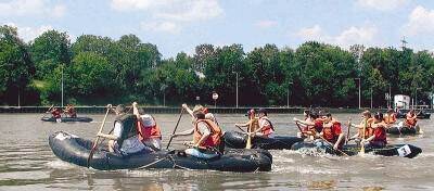 Die Organisation der Veranstaltung liegt komplett in den Händen der Gundelsheimer Jugendfeuerwehr und deren Betreuern. Auch die Verpflegung der Teilnehmer und ihrer zahlreichen Fans klappt reibungslos. Jeweils vier Floriansjünger sitzen mit Schwimmweste und Paddel in einem Schlauchboot. Auch Mädels sind dabei. Als kleiner, heller Punkt ist neckaraufwärts die Boje zu erkennen. 500 Meter sind es vom Start bis dorthin und der selbe Weg ist auch flussabwärts wieder zurückzulegen.