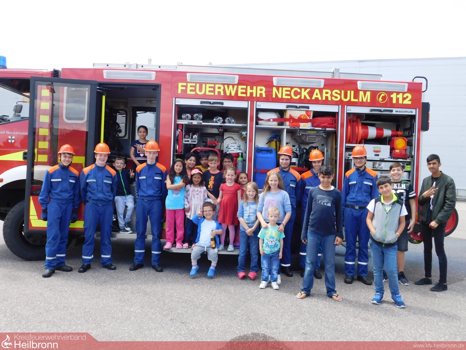 Über 40 Kinder und Erwachsene des Asylbewerberwohnheims in Neckarsulm haben am Sonntag, den 21. Mai gemeinsam mit sechs Mitgliedern der Jugendfeuerwehr einen abwechslungsreichen Mittag erlebt. Grund für das Projekt war nicht nur die Tatsache, dass es Teil des Abzeichens „Jugendflamme 3“ ist, sondern man auch aktiv einige Stunden für die Kinder des Asylbewerberheimes gestalten wollte. (Neben dem sozialen Projekt werden bei der Jugendflamme 3 auch ein Löschangriff vorgetragen, sowie ein Fallbeispiel in Erster Hilfe abgefragt, wo eine verletzte Person fachmännisch versorgt werden muss)
