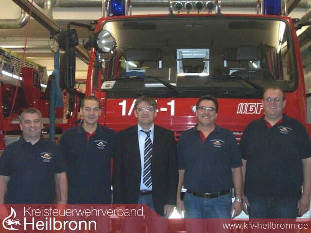 Bild: von links nach rechts: Frank Pitz stv. Abt-Kdt., Thomas Blösch stv. Stadtkommandant, Dietmar Beisel SV-Versicherung, Martin Kuhmann Stadtkommandant und Thorsten Lang stv. Stadtjugendfeuerwehrwart.