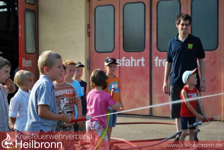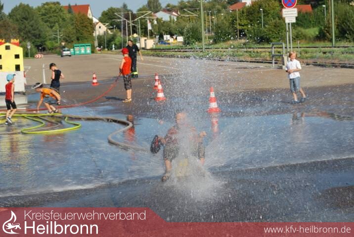 Vor dem Feuerwehrhaus waren verschiedene Spielstationen aufgebaut. Klar dass dort vor allem das Wasser, die Allzweckwaffe der Feuerwehr, die Hauptrolle spielte. So musste beim Kleiderstaffellauf Wasser in einem Becher über einen Hindernisparcours befördert werden. Und das in voller Einsatzkleidung, Jacke und Schuhe um Nummern zu groß. Dann musste mit dem Wasserstrahl ein Tennisball in einer schräg noch oben liegenden Dachrinne so weit hochgespritzt werden, bis der ins Ablaufrohr fiel. An einem Übungshaus mussten nun die aus dem Dach schlagenden Flammen gelöscht werden. Je besser man in die Fenster spritzte, desto schneller sind die Flammen erloschen.