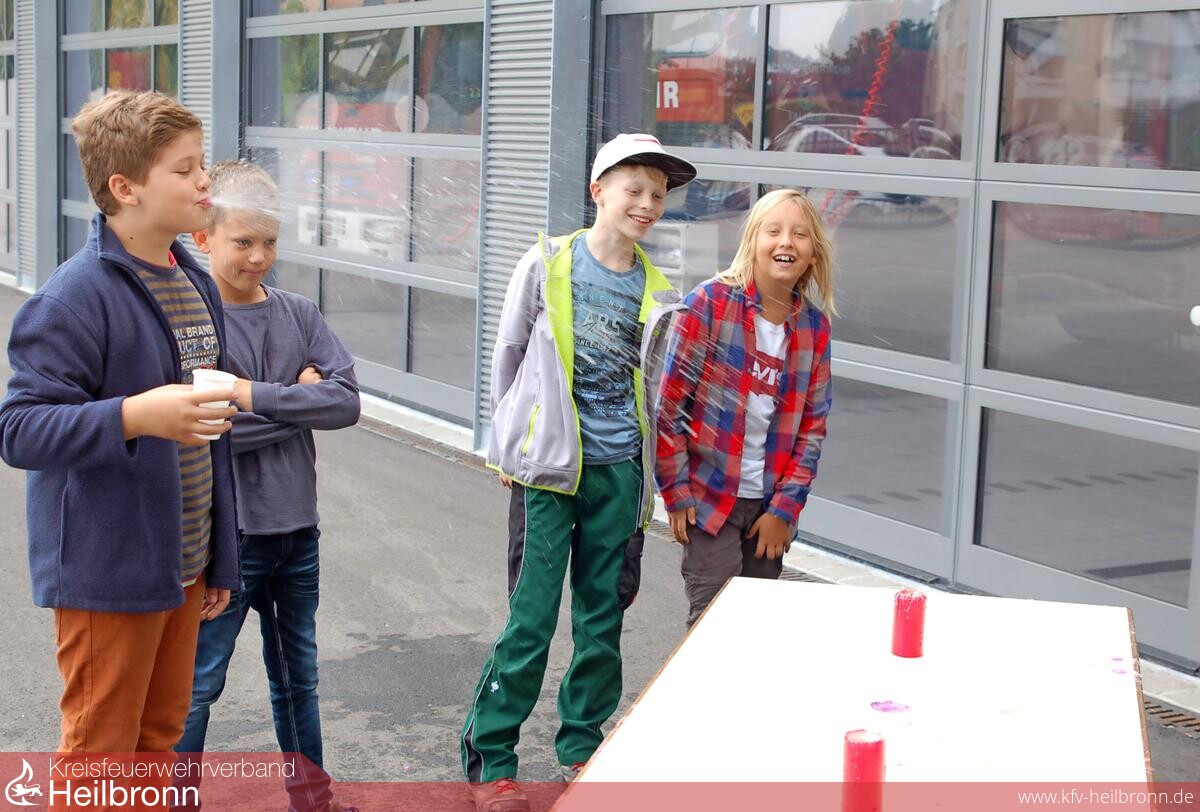 Brandgefahr Während im Flur Wasserflaschenkegeln auf dem Programm steht, warten im Hof ein paar brennende Kerzen. Die müssen natürlich gelöscht werden, höchste Brandgefahr. Und wie macht man das am besten? Wasser in den Mund und drauf los spucken. Die Kinder haben einen Heidenspaß, und da stört auch die Außentemperatur von 15 Grad nicht. Ein bisschen Nässe schadet nicht.