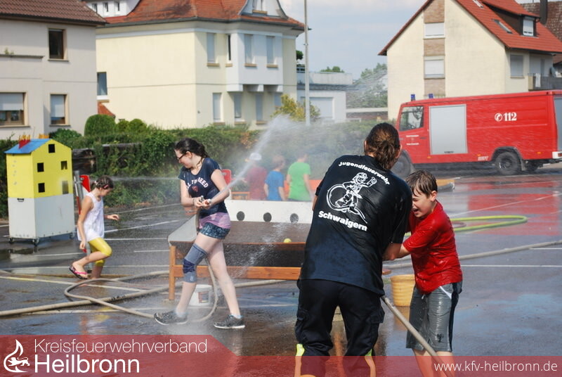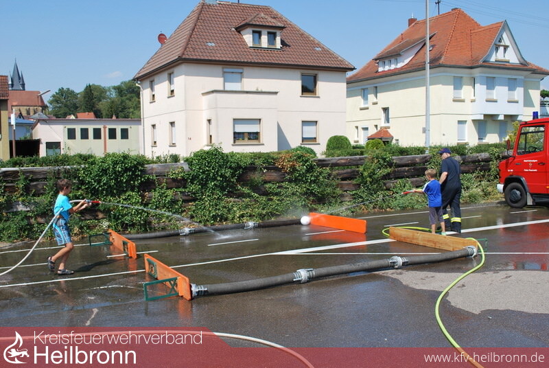 Schlauch Puh, ganz schön warm, er darf sich schnell wieder ausziehen. Die Kinder teilen sich jetzt in Gruppen auf. Eine geht zuerst ans Telefon und übt den Notruf, eine darf mit dem Feuerwehrauto fahren und drei werden nass. „Suddeln“, wie es Wagenplast ausdrückt, gehört einfach zu einem Tag bei der Feuerwehr dazu. Also Schlauch in die Hand und Wasser marsch! Da werden Tennisbälle in Löchern versenkt, ein Haus gelöscht und Fußball mit Wasserdruck gespielt. „Schau mal, ich bin schon ganz nass“, ruft ein Mädchen fröhlich. Egal, bei der Hitze wird das schnell wieder trocken, es sei denn, man suddelt noch etwas länger.