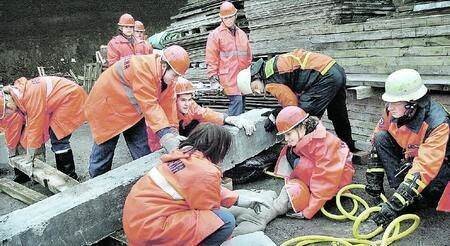 Ein Stahlbetonträger hat einen Arbeiter unter sich begraben. Alarm im Feuerwehrmagazin. Nicht die Profis eilen aus dem Magazin. Heute ist die Jugendwehr gefordert. Kommandant Reinhold Korb macht die einspurige Baustelle am Berg mit Martinshorn und Blaulicht frei fürs Löschfahrzeug und die Drehleiter.