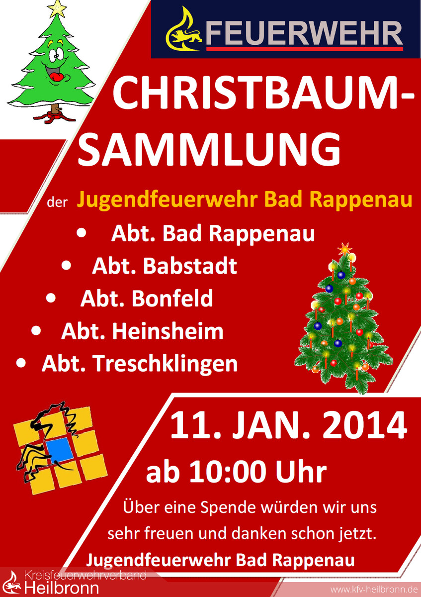 Wie alljährlich trafen sich am Samstag nach „Heilig Drei König“ die Jugendfeuerwehrmitglieder der Abteilungen Bad Rappenau, Bonfeld, Heinsheim und Treschklingen ab 10:00 Uhr an den jeweiligen Feuerwehrhäusern. Auch in diesem Jahr wurden wieder die ausgedienten Weihnachtsbäume in den jeweiligen Ortsteilen eingesammelt. Auch die Jugendgruppe der Abt. Babstadt hat sich dieses Jahr entschlossen und sammelt in Babstadt die Weihnachtsbäume ein.