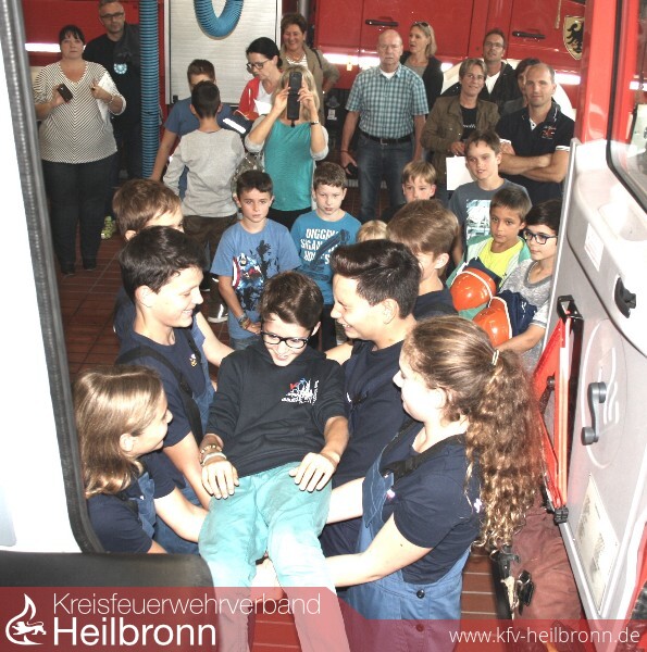 Nach den Grußworten stiegen die Kinder nacheinander in das HLF (Hilfeleistungslöschfahrzeug) ein. Dort verabschiedeten sich die Betreuerinnen von den Kindern und übergaben ihnen einen Teil ihrer neuen Jugenduniform. Auf der anderen Seite des Fahrzeuges warteten schon die neuen Kameraden der Jugendfeuerwehr und empfingen die Kinder mit offenen Armen.