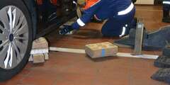 Es galt einen Werkstattwagen auf dem sich ein mit Wasser gefülltes Gefäß befand, so anzuheben und zu unterbauen, dass der Wagen frei stand, ohne dass das Wasser verschüttet wurde.
