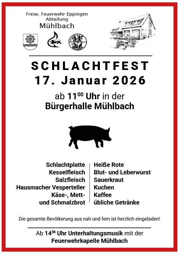 Am Samstag, 17. Januar 2026 veranstaltet die Feuerwehrabteilung Mühlbach wieder ihr traditionelles Schlachtfest in der Mühlbacher Bürgerhalle.