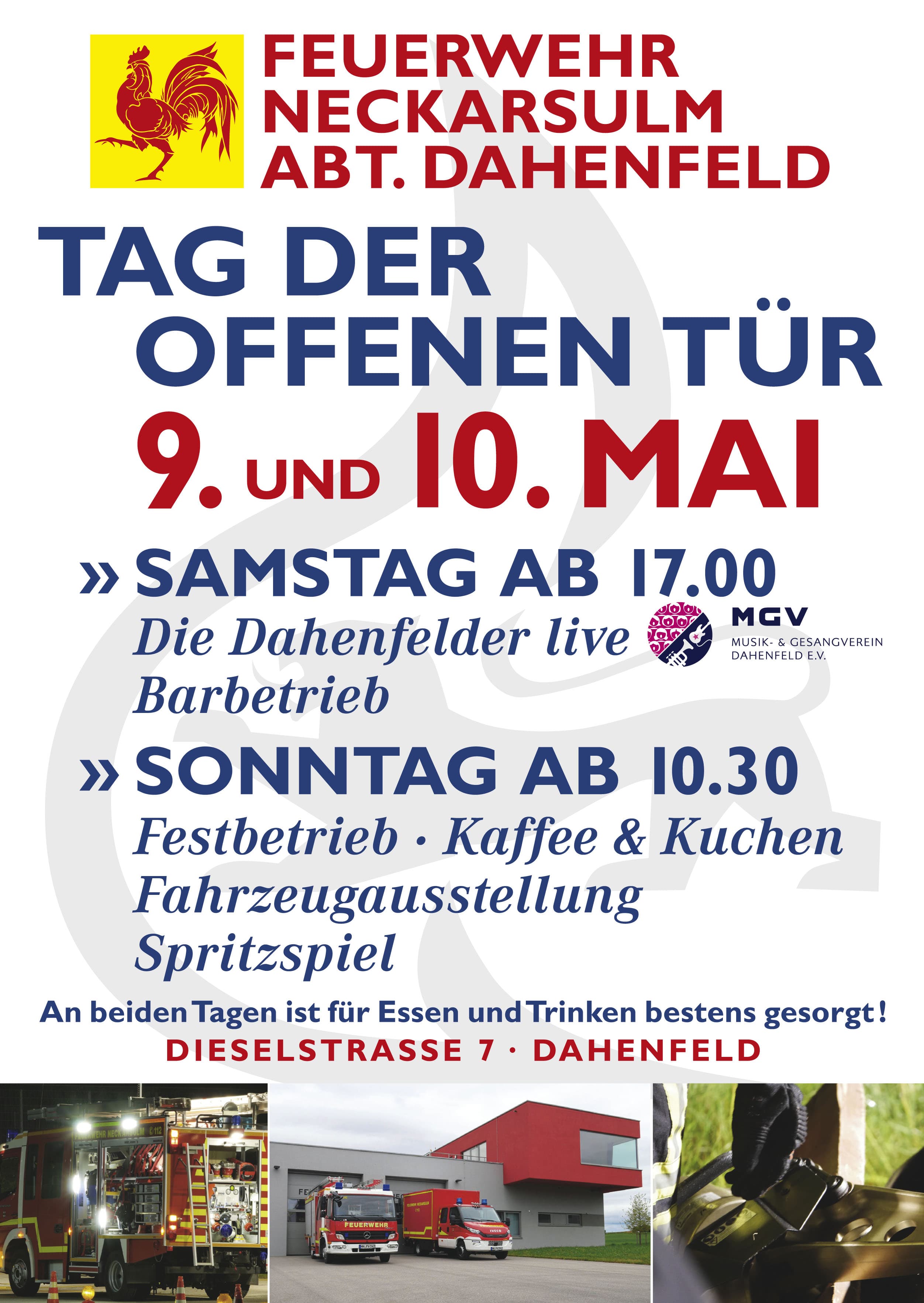 Herzliche Einladung zum Tag der offenen Tür der Feuerwehr Neckarsulm Abteilung Dahenfeld am Feuerwehrhaus in der Dieselstr. 7, 74172 Neckarsulm Dahenfeld.