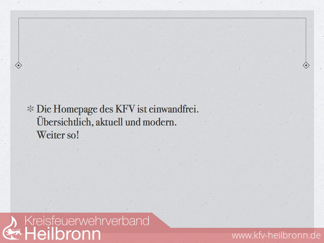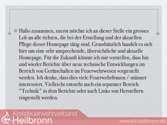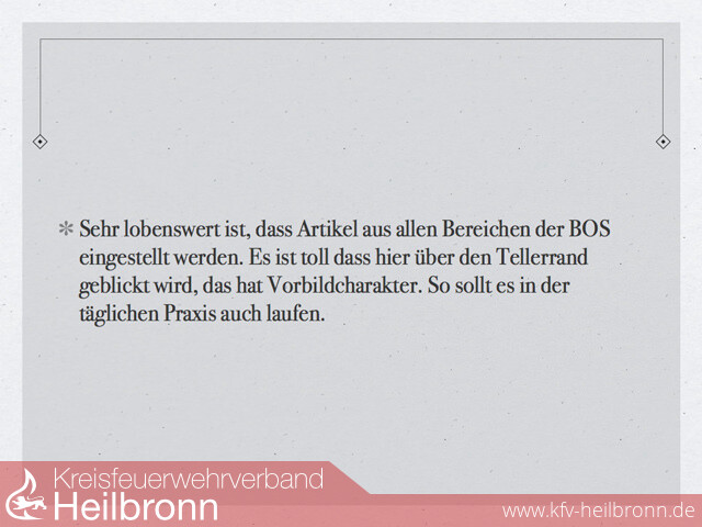 Teilweise ist es in den Artikeln sehr unübersichtlich, von welcher Feuerwehr es sich überhaupt handelt. Dabei steht weder in der großen Überschrift, noch in der kleinen Überschrift die Feuerwehr. Man liest es oft erst wenn man den Text gut durchliest! Wäre vielleicht ein Verbesserungsvorschlag, wenn man in der Überschrift (in Klammer oder irgendwie als Zusatzhinweis) gleich lesen könnte, von wem es sich eigentlich handelt. Aber ansonsten ist es die beste Internetseite die ich über die Feuerwehr kenne! Es ist eine der ersten Seiten, die ich täglich lese oder nachschaue! Weiter so!!!Das mit den betreffenden Feuerwehren ist eine berechtigte Kritik, der Verbesserungsvorschlag wird sicherlich nicht unerhört bleiben.