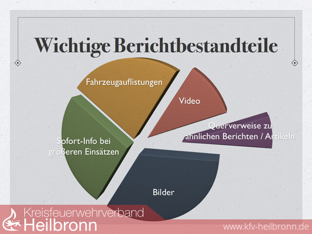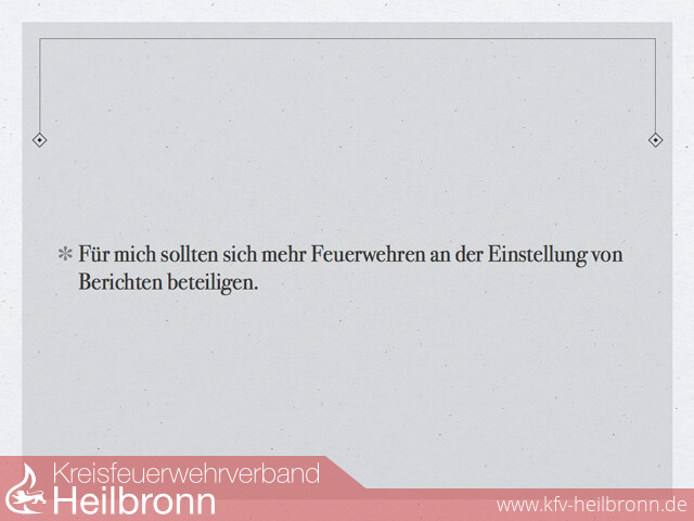 Für mich sollten sich mehr Feuerwehren an der Einstellung von Berichten beteiligen.Dies ist auch unser Wunsch, nur können und werden wir den einzelnen Wehren nicht vorschreiben an dieser Seite in Form von Berichten mitzuarbeiten.