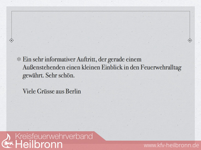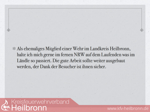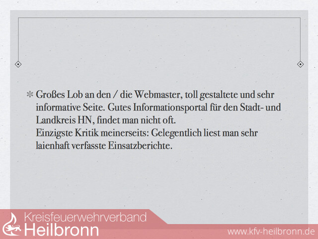 Großes Lob an den/die Webmaster, toll gestaltete und sehr informative Seite. Gutes Informationsportal für den Stadt- und Landkreis HN, findet man nicht oft. Einzigste Kritik meinerseits: Gelegentlich liest man sehr laienhaft verfasste Einsatzberichte..Vielen Dank für das Lob. Wir werden die Seiten weiterhin kontinuierlich weiterentwickeln und die Inhalte weiterhin wenn möglich tagesaktuell aktualisieren. Wir werden allerdings nicht jeden Bericht so überarbeiten, das er wie von einem Profi geschrieben aussieht. Dazu haben wir einfach nicht die Zeit. Für die Berichtqualität ist jeder Verfasser selbst verantwortlich.