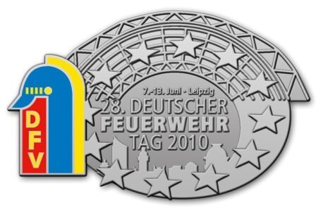 Glänzendes Metall und ein bunter Farbtupfer: Das Tagungsabzeichen zum 28. Deutschen Feuerwehrtag 2010 vereint in seiner Gestaltung die historischen Abzeichen vergangener Feuerwehrtage mit dem modernen Logo der Großveranstaltung in Leipzig. Vom 7. bis 13. Juni 2010 findet dort der 28. Deutsche Feuerwehrtag des Deutschen Feuerwehrverbandes (DFV) statt.