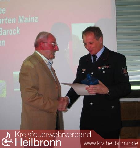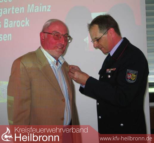„In Würdigung seiner Verdienste für das Feuerwehrwesen und für seine Kameraden in den Altersabteilungen verleiht der Kreisfeuerwehrverband Heilbronn Werner Kümmerle die Ehrennadel des Verbandes„ formulierte Reinhold Gall die Verleihung. Unter großem Beifall überreichte Gall die zugehörige Urkunde und als Geschenk eine Uhr in einer Edition des Feuerwehrhotels am Titisee.