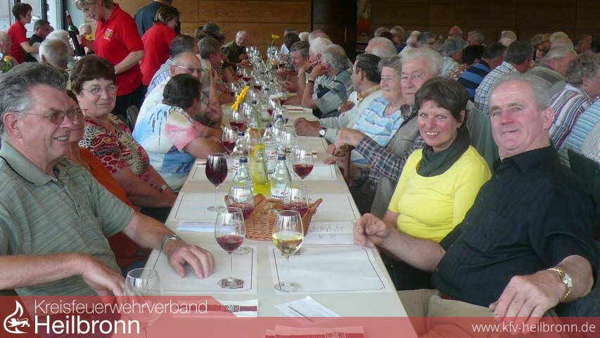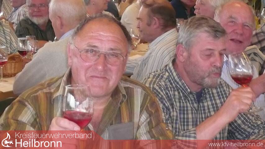Kaffee und Kuchen, ein Vesperteller sorgten für das leibliche Wohl. Eine Weinprobe rundete den kameradschaftlichen Teil des Spätnachmittags ab. Rudolf Kühner, seit 52 Jahren Mitglied der FF Weinsberg führte durch und erläuterte die Proben. Er vermittelte Wissenswertes rund um den Heilbronner Wein, von der Trollinger Traube über moderne Rebsorten wie den Acolon. Kenner verkosteten u.a. einen im Holzfass gereiften Lemberger, ein lieblicher Muskateller wurde nicht nur von den Frauen genossen. Passende Trinksprüche gab es natürlich auch, z.B. frei nach dem ersten Bundespräsidenten Theodor Heuss „Wer Wein säuft sündigt - wer Wein trinkt betet“