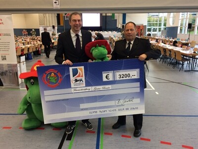 Bernd Meierbeck, Initiator der Aktion, am Rande der Verbandsversammlung des Landesfeuerwehrverbandes am 22. Oktober 2016 in Buchen einen symbolischen Scheck an den Geschäftsführer der Stiftung Eberhard Jochim.