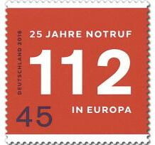 Sie ist ebenso markant wie einfach: Unter der Telefonnummer 112 erreichen Menschen in ganz Europa schnelle Hilfe. Zum 25. Geburtstag der europaweiten Einführung der kostenfreien Notrufnummer hat das Bundesministerium der Finanzen nun extra eine Briefmarke herausgegeben. Das Postwertzeichen zeigt â ebenfalls markant einfach â eine weiße Zahl auf rotem Grund. Die 45 Cent-Briefmarke ist ab dem Erstausgabetag 11. Februar 2016 an allen Verkaufsstellen der Deutschen Post AG erhältlich. Dieser Tag ist der âEuropäische Tag der 112â, der zum achten Mal stattfindet und den einheitlichen Notruf noch bekannter machen soll.