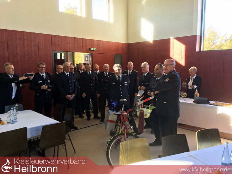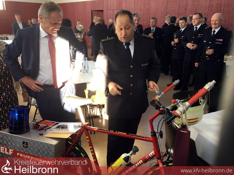 Als symbolisches Geburtstaggeschenk überreichte der stellvertretende Verbandsvorsitzende Branddirektor Eberhard Jochim ein mit zahlreichen Feuerwehrutensilien ausgestattetes Fahrrad. Hintergrund ist, dass sich Reinhold ein neues Fahrrad zulegen möchte. Die Feuerwehren und Ausschussmitglieder übergaben dazu jeweils einen Gutschein als Anschubfinanzierung.