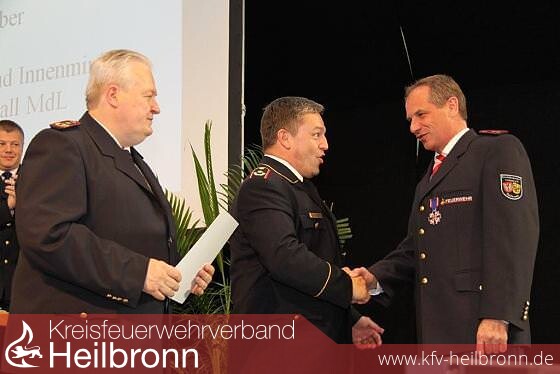 Der baden-württembergische Innenminister Reinhold Gall ist bei der Verbandsversammlung des Landesfeuerwehrverbandes am vergangenen Wochenende in Breisach (Kreis Breisgau-Hochschwarzwald) mit dem Deutschen Feuerwehr-Ehrenkreuz in Silber ausgezeichnet worden. Der Minister, seit 1975 in der Feuerwehr Obersulm aktiv, wurde von Verbandspräsident Frank Knödler (Foto: links) und vom Vizepräsidenten des Deutschen Feuerwehrverbandes Ralf Ackermann (Mitte) wegen seines großen Engagements als Vorsitzender des Kreisfeuerwehrverbandes Heilbronn (seit 2009) gewürdigt.