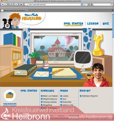 Die Internetseite richtet sich an Kinder zwischen 7 und 12 Jahren. Bei einem Abenteuerspiel werden sie mit vielen Aspekten des Gefahrenschutzes und dem richtigen Verhalten bei Katastrophen bekannt gemacht. Gemeinsam mit dem Hund Flocke - dem Maskottchen der Website - suchen die jungen Nutzer nach dessen Herrchen Max und haben dabei verschiedenen Gefahren wie Feuer, Hochwasser oder Gewitter zu trotzen. Die Kinder lernen spielerisch, wie wichtig Erste Hilfe und richtige Versorgung im Notfall sind. Auch Eltern und Lehrkräfte sind willkommen, ihnen stehen verschiedene Arbeitsblätter mit Bausteinen rund um das Thema Bevölkerungsschutz zur Verfügung, die zum Beispiel bei einem Projekt zum Thema Erste Hilfe oder Brandschutz, eingesetzt werden können. Weitere Angebote auf max-und-flocke-helferland.de sind ein Quiz, Mal- und Spielvorlagen sowie die Helferlandreporterseite, auf der die jungen User eigenen Erfahrungen und Geschichten veröffentlichen können.Verantwortlich für max-und-flocke-helferland.de ist das Bundesamt für Bevölkerungsschutz und Katastrophenhilfe (BBK), das 2004 als zentrales Organisationselement für die Zivile Sicherheit gegründet wurde. Es ist Teil der Neuen Strategie zum Schutz der Bevölkerung in Deutschland, die 2002 beschlossen wurde. Alle Bereiche der Zivilen Sicherheitsvorsorge berücksichtigt dasBBK fachübergreifend und verknüpft sie zu einem wirksamen Schutzsystem für die Bevölkerung und ihre Lebensgrundlagen. DasBBK ist eine Fachbehörde des Bundesministeriums des Innern (BMI), die auch andere Bundes- und Landesbehörden bei der Erfüllung ihrer Aufgaben im Bevölkerungsschutz kompetent berät und unterstützt.