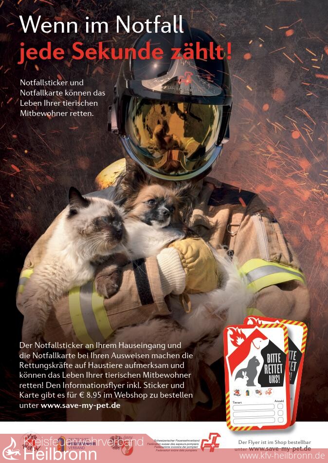 Der Hund im brennenden Wohnzimmer, das Schlangenterrarium im vollgelaufenen Keller, die Katze im Schlafzimmer der gestürzten Seniorin: Feuerwehrangehörige haben im Einsatz häufig mit Tieren zu tun, auch wenn sie nicht direkt Ursache des Alarms sind. Hier ist es hilfreich für die Einsatzkräfte, bereits vor dem Betreten einer Wohnung zu erfahren, ob und gegebenenfalls welche Haustiere sich hinter der Tür verbergen. In Kooperation mit der Tierorganisation „Vier Pfoten“ gibt es nun im Versandhaus des Deutschen Feuerwehrverbandes (DFV) ein aus Notfallsticker und Notfallkarte bestehendes Set für Haustierbesitzer.