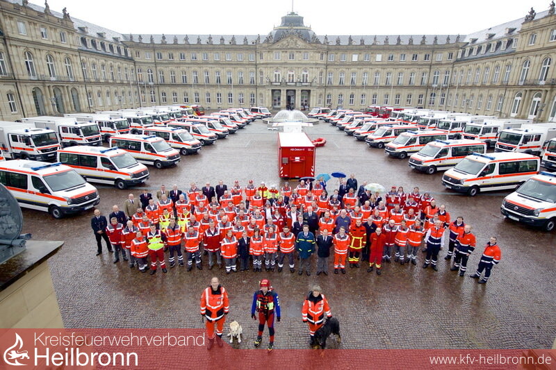 Bild 1: Vertreterinnen und Vertreter der Hilfsorganisationen vor den neuen Fahrzeugen im Ehrenhof des Neuen Schlosses