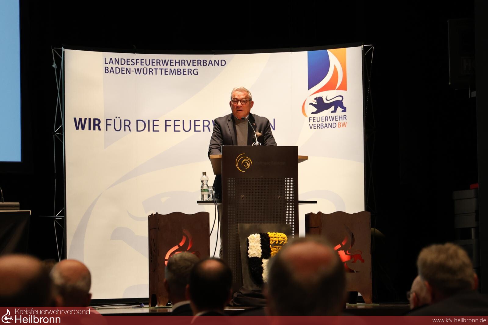 Der Samstag war dann der Verbandsarbeit gewidmet. Präsident Wegel stellte seine Rede unter das Motto „Für Sicherheit, Zusammenarbeit und Zukunft“. An alle Verantwortlichen stellte er die Frage, sind unsere Strukturen noch zeitgemäß oder müssen sie verändert werden? Wegel forderte hierzu eine offene Diskussion, auch in den Feuerwehren selbst. Bemerkenswert! An den anwesenden Innenminister Strobl gerichtet, erhob Wegel u.a. folgende Forderungen