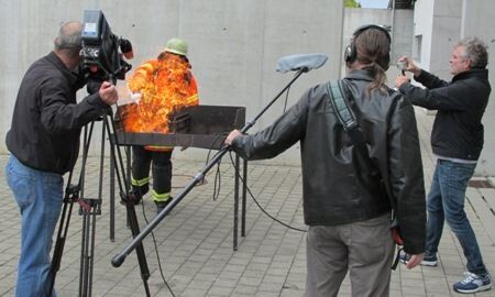 Was passiert, wenn man brennendes Fett mit Wasser löschen will? Das war eine der Fragen, die ein Kamerateam um Reporter Anton Jany für die ZDF-Drehscheibe bei der Landesfeuerwehschule Baden-Württemberg in Bruchsal für das Fernseh-Publikum klären ließ. „Wir wollen mit dem Beitrag zeigen, welche Brandgefahren im Haushalt lauern, wie man sich richtig verhält, um die Risiken zu minimieren und falls es doch brennt, wie man am besten löscht“, erläutert Jany. Hätten Christian Schwandner und Kersten Wachter, beide Ausbilder an der Landesfeuerwehrschule, beim Nachstellen der Szene mit der Fettexplosion keine Schutzausrüstung getragen, die Folgen wären fatal gewesen - Jany wollte genau das eindrucksvoll darstellen und ist entsprechend zufrieden mit den Bildern. Er und sein Team zeigen sich glücklich, dass ihnen die Experten der Landesfeuerwehrschule Gelegenheit geben, mit imposanten Bildern ihre Botschaft zu visualisieren. Ein brennender Toaster etwa oder die Gefahr einer unkontrollierbaren Flamme, die von zusammengestellten Teelichtern ausgehen kann, sind ebenso Sequenzen des Drehtages, wie das unsachgemäße Anzünden eines Holzkohlegrills mit Ethanol oder Spiritus. Auch die furchteinflößende Stichflamme diese Szene beeindruckt das Kamerateam.Ein weiterer Aspekt, der im Brandübungshaus gefilmt wurde, ist das richtige Verhalten, wenn der Fluchtweg verraucht ist. „Für uns ist es ideal, dass wir auf dem Übungsgelände der Landesfeuerwehrschule derart unterschiedliche Szenarien drehen können“, sagt Jany. Gleichzeitig betont der Leiter der Landesfeuerwehrschule Thomas Egelhaaf den Synergieeffekt: „Wenn der Ausbildungsbetrieb nicht beeinträchtigt wird, sind wir selbstverständlich froh, auch in der Prävention mitwirken und unser Wissen der breiten Öffentlichkeit zur Verfügung stellen zu können.“